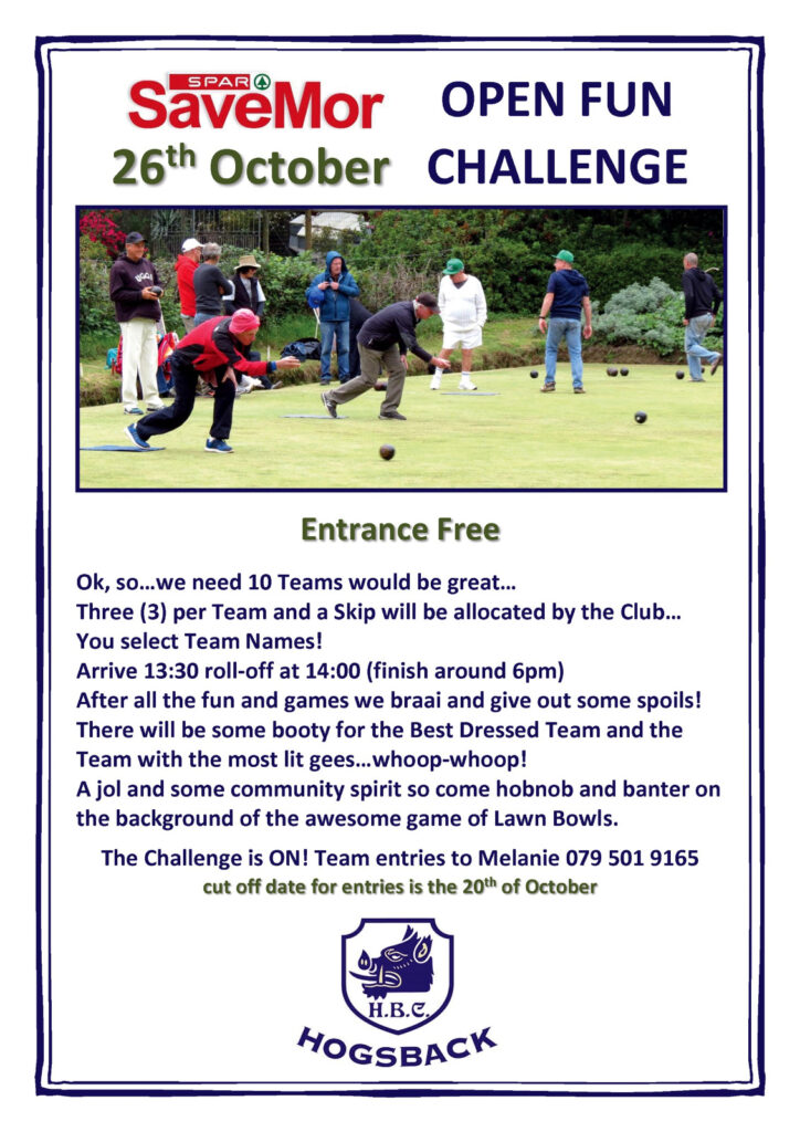 SaveMor Open Fun Bowling Club Challenge – ALL WELCOME! + Add to Google Calendar + iCal / Outlook export The event is finished. Tags: bowls, braai, Community, fun, prizes Date 26 10 2024 Expired! Time 1:30 pm - 6:00 pm Labels Events Location Hogsback Bowling Club Category Clubs and organisations Community Support Events Family Fun Food and drinks Health and well-being Sport & Recreation Organizer Melanie de Wit Phone 0795019165 Share this event