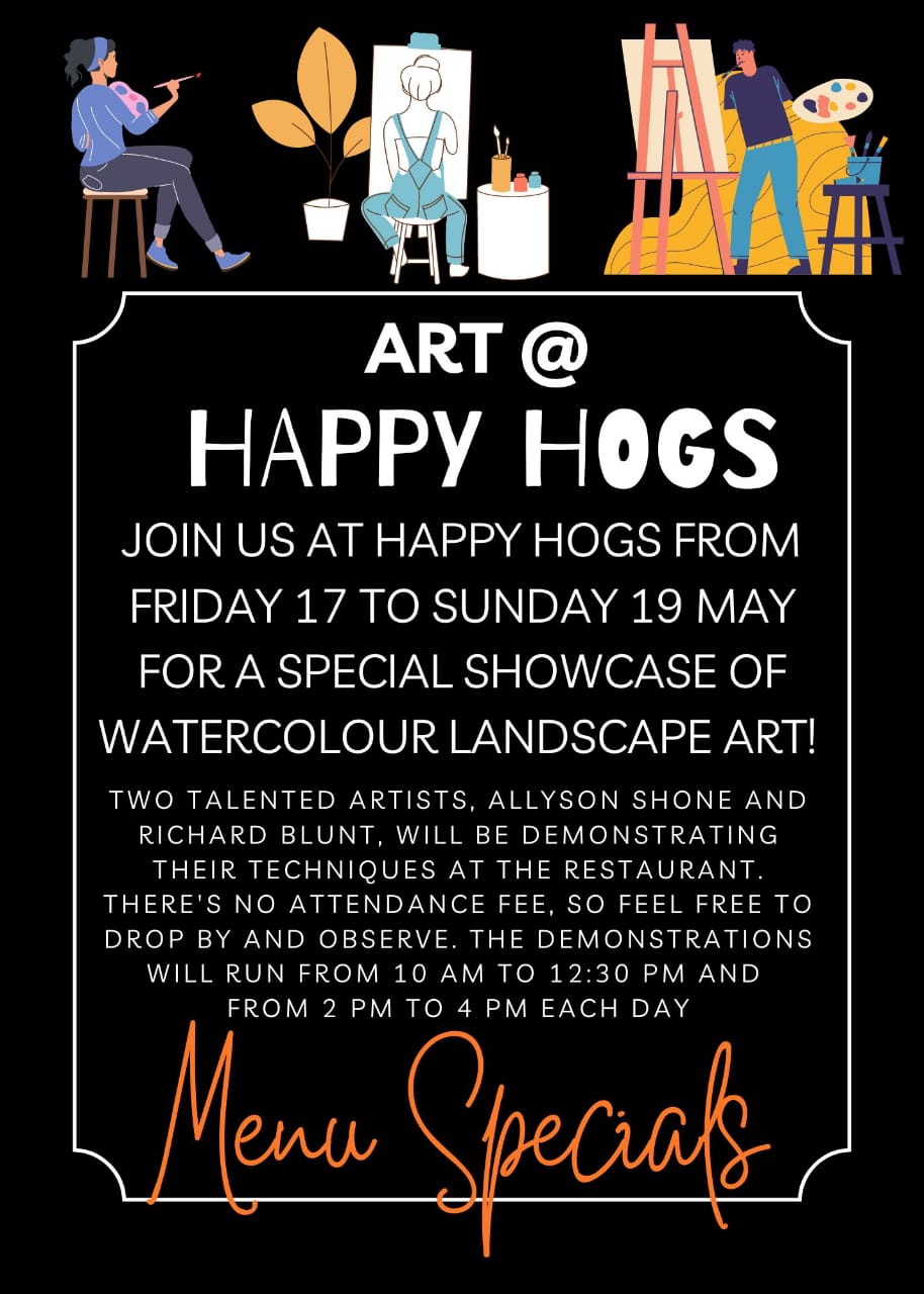 Art at Happy Hogs + Add to Google Calendar + iCal / Outlook export The event is finished. Tags: art, demonstration Date 17 - 19 05 2024 Expired! Time 10:00 am - 4:00 pm Location Happy Hogs Hogsback Website https://happyhogs.hogsback.info Category Art and Crafts Workshops Share this event