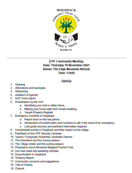 Notice are given of the annual AGM of the Hogsback Community Policing Forum, which will take place on Thursday 18 November 2021 At the Vula Vista Room at the Edge. All community members welcome.