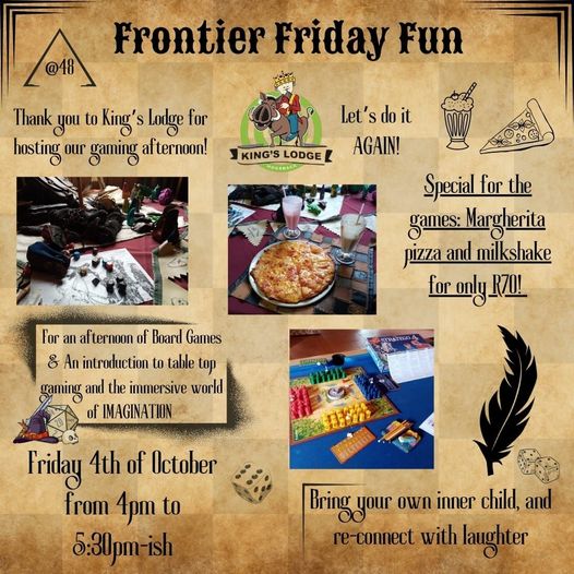 Frontier Friday Fun + Add to Google Calendar + iCal / Outlook export The event is finished. Tags: board games, frontier, games, gaming Date 04 10 2024 Expired! Time 4:00 pm - 5:30 pm Labels Events Location Kings Lodge Hotel Hogsback Website https://kingslodgehogsback.co.za/ Category Events Family Fun Food and drinks Sport & Recreation Organizer Wayne Benade Phone 079 193 7368 Share this event