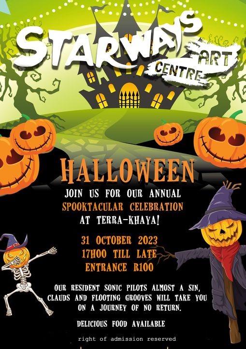 HALLOWE’EN CELEBRATION + Add to Google Calendar + iCal / Outlook export The event is finished. Tags: Activities, events, food, halloween, hogsbackcelebrations, live music, party Date 31 10 2023 Expired! Time 5:00 pm Cost R100.00 Labels Events Location Terra-Khaya Category Events Food and drinks Music Organizer Starways Art Centre Phone 082 928 5770 Website https://www.starwaysarts.com/ Share this event