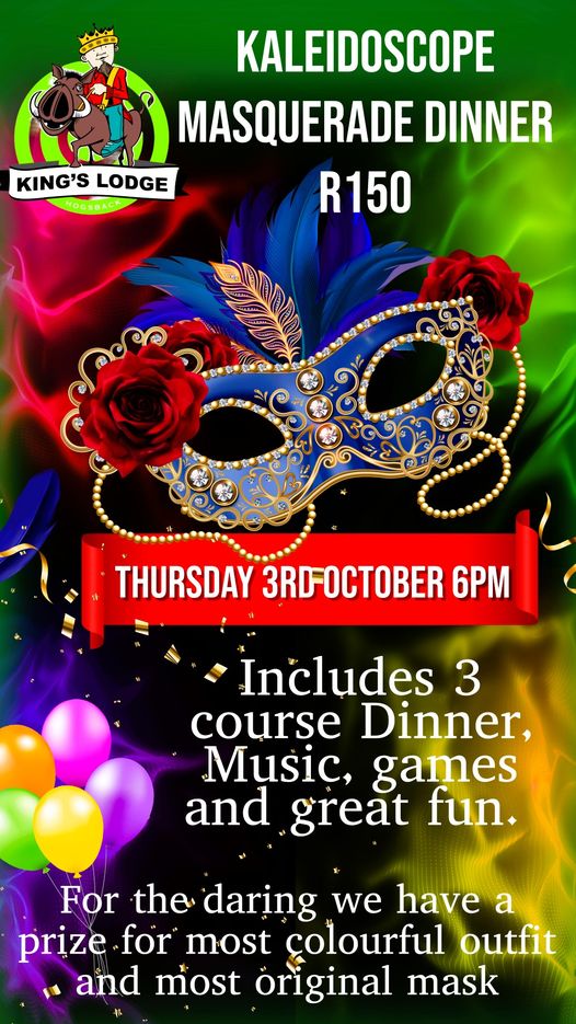 Kaleidoscope Masquerade Dinner + Add to Google Calendar + iCal / Outlook export The event is finished. Tags: dinner, fundraiser, games, Kings Lodge, masquerade, music, prizes, Simple Sense Date 03 10 2024 Expired! Time 6:00 pm Cost R150.00 Labels Events Location Kings Lodge Hotel Hogsback Website https://kingslodgehogsback.co.za/ Category Community Support Events Family Fun Food and drinks Fundraiser Music Organizer King's Lodge Hotel Email info@kingslodgehogsback.co.za Share this event