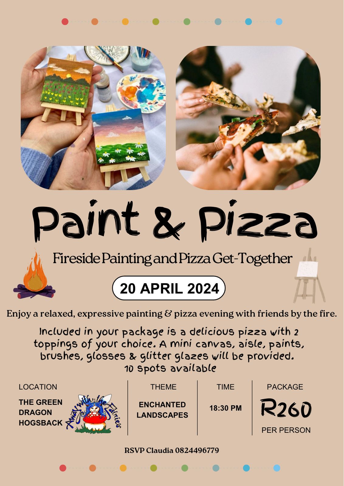 PAINT & PIZZA + Add to Google Calendar + iCal / Outlook export The event is finished. Tags: art, pizza Date 20 04 2024 Expired! Time 6:30 pm Cost R250.00 Labels Events Location Away with the Fairies Away with the fairies, 24 Hydrangea Lane, Hogsback, 5721 Category Art and Crafts Events Food and drinks Share this event