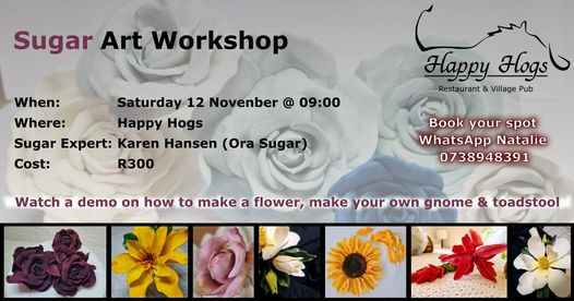 SUGAR-ART WORKSHOP + Add to Google Calendar + iCal / Outlook export The event is finished. Tags: Activities, food, workshops Date 12 11 2022 Expired! Time 9:00 am Cost R300 Location Happy Hogs Hogsback Website https://happyhogs.hogsback.info Category Art and Crafts Events Workshops Share this event