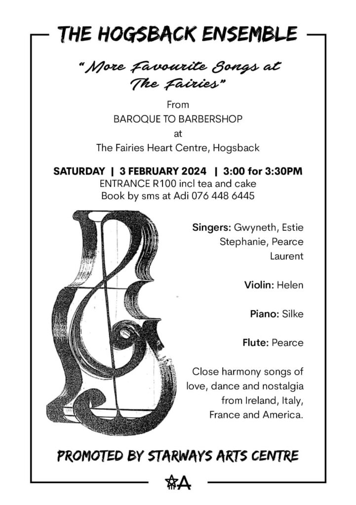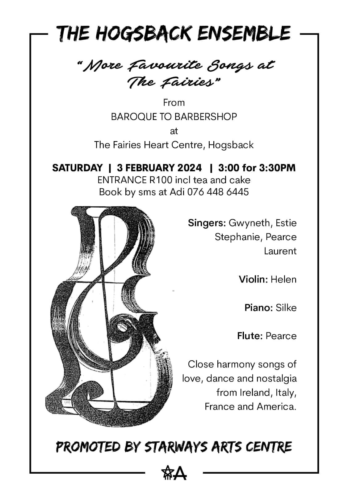 THE HOGSBACK ENSEMBLE + Add to Google Calendar + iCal / Outlook export The event is finished. Tags: Activities, Community, event, live music, music Date 03 02 2024 Expired! Time 3:00 pm Cost R101.00 Location Away with the Fairies Away with the fairies, 24 Hydrangea Lane, Hogsback, 5721 Category Community Support Events Family Fun Music Organizer Adi Meintjies Phone 0764486445 Share this event