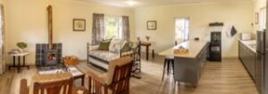- Open-plan living/kitchen/dining area with comfortable seating around a combustion stove