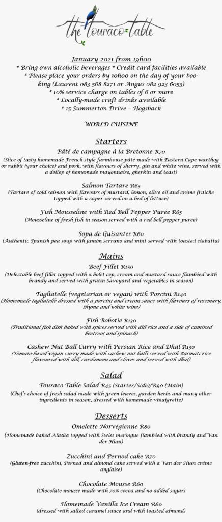 Touraco Table January 2021 Menu Posted on 07/01/2021 by Maggie Verster As per usual, Touraco Table changes their menu every month. This month’s gourmet offerings sound truly mouth watering. Remember to book in advance and to take your own alcoholic beverages.